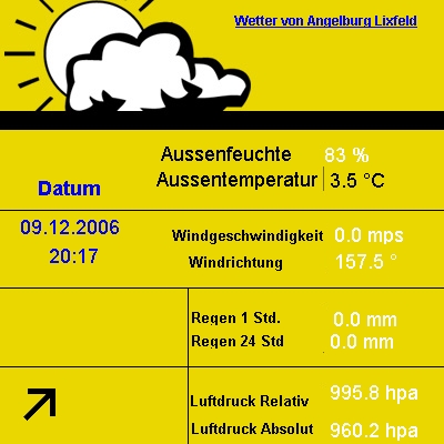 | | Derzeit können wir aus technischen Gründen KEINE aktuellen Wetterdaten aus Angelburg-Lixfeld präsentieren. Wir arbeiten daran sobald als möglich wieder aktuell zu werden. Bitte schauen Sie immer mal wieder vorbei. Standortdaten: 452 m über NN, 50° 49' nördlicher Breite, 8° 40' östlicher Länge